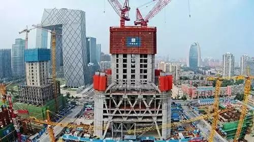 ▲2015年3月中国尊大厦项目主塔楼智能顶升钢平台体系安装完成。该体系为世界房建施工领域较重、面积较大、承载力较高、世界首次与大型塔吊一体化结合的钢平台体系。