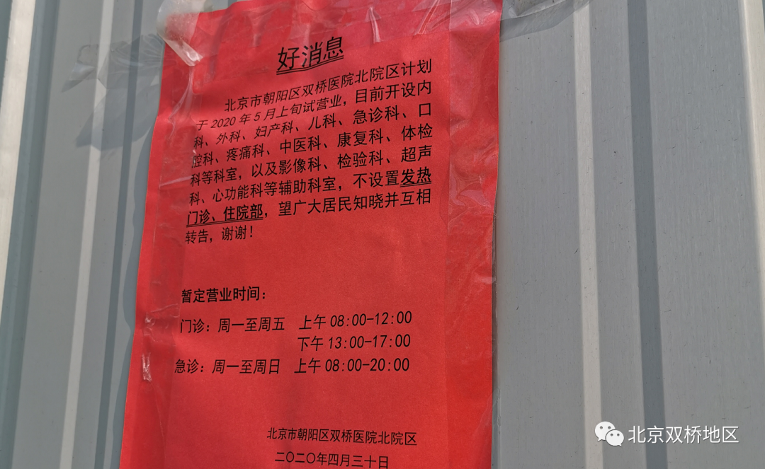 ㅿ双桥医院北院区计划在5月上旬试营业,目前开设内科、外科、妇产科、儿科、急诊科、口腔科、疼痛科、中医科、康复科、体检科等科室,以及影像科、检验科、超声科,心功能科等辅助科室,不设置发热门诊、住院部。并贴有暂定的营业时间。