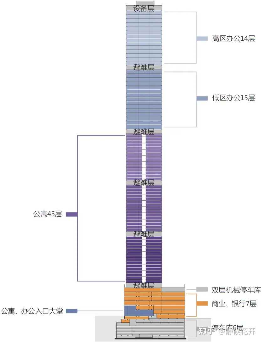 第二,建筑师陪伴业主重新策划及调整业态组成历时两年。这期间,建筑师结合业主对功能的要求,重新进行区域内建筑高度体量与现状城市建筑体量的对比研究,新建筑的体量曾历经342 m、260 m、432 m、280 m、369 m多个高度体量的功能定位(图1),交通流线、车库容量及运行效率的比对,招商目标的市场定位,城市天际线设计研究等工作,配合营销策划专业公司的产品调研,最终取消高区超五星级酒店功能及高级公寓的数量,以卸载多交通流线和停车量所造成的城市区域压力(如删除旅游团队大巴、餐饮、婚宴、游客、物资供配及垃圾运送等酒店专属流线),以业态的取舍平衡城市核心区域持续良好环境与交通效率之间的矛盾(图2)。