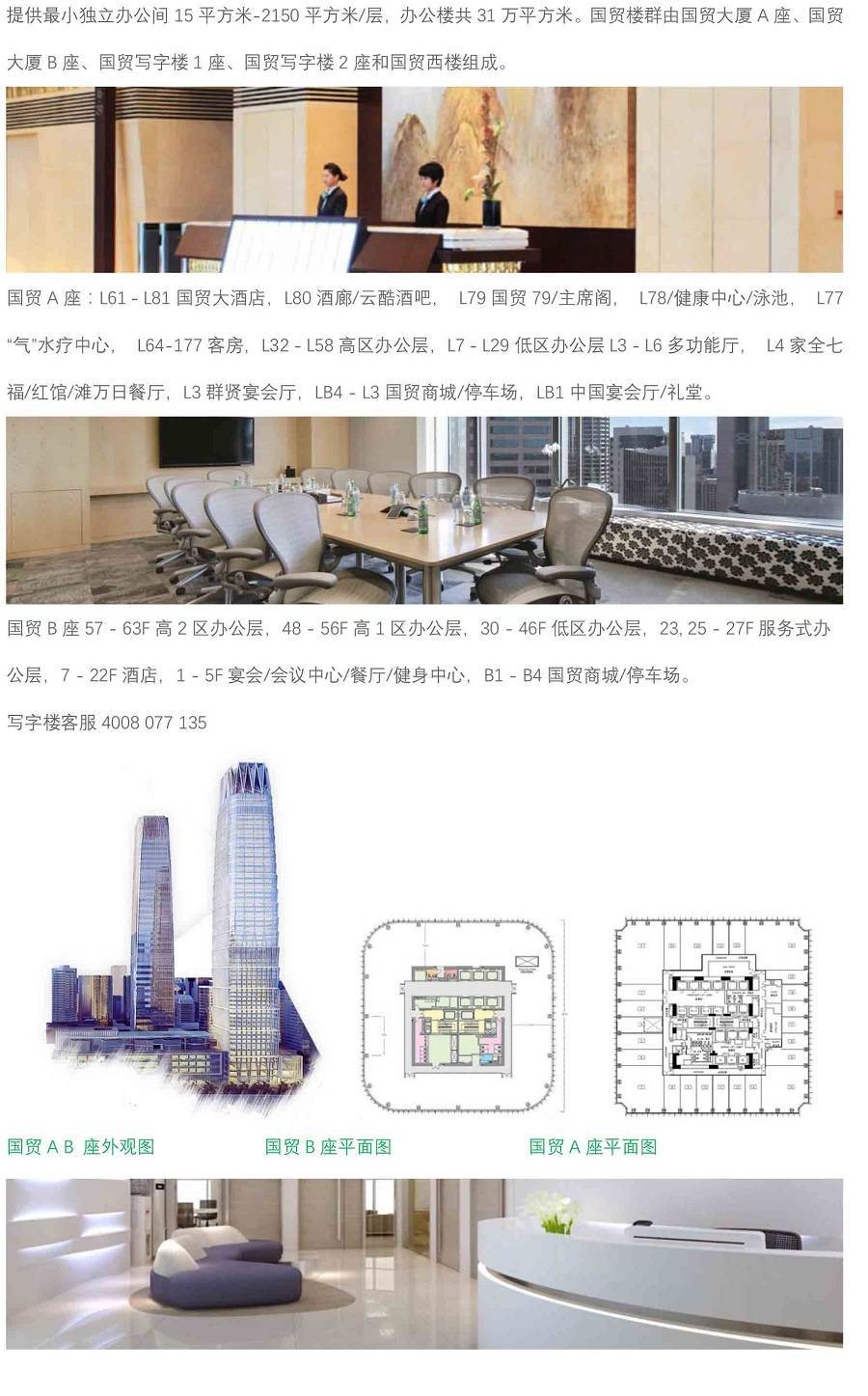 北京国贸大厦三期A座位于北京市朝阳区建国门外大街1号由中国国际贸易中心股份有限公司开发并由国贸物业酒店管理有限公司进行日常管理。办公楼租赁楼层为7-58层,出租面积由全装全配的服务式办公间20平方米起,到约2500平方米/层。