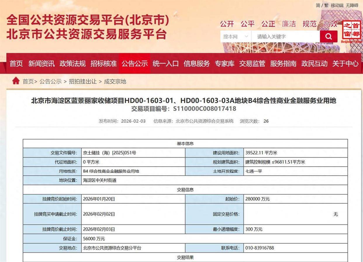 抖音集团旗下的北京云月长石科技有限公司在2026年北京首场土拍中,以28亿元底价拿下海淀区蓝景丽家收储项目地块,土地面积3.95万平方米,建筑控制规模不超过9.68万平方米。